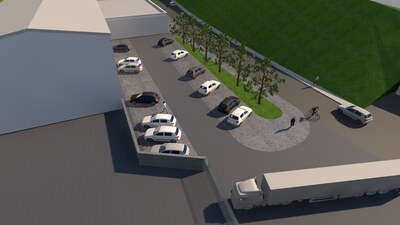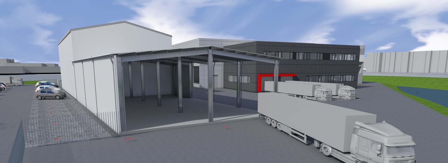 V Úpici jsme navrhli rozšíření areálu soukromé firmy o dva nové objekty – přístavbu administrativní a expediční budovy a přístřešek pro skladování materiálu. Přístavba rozšiřuje provozní kapacitu areálu – v přízemí se nachází skladovací hala s rampou pro kamiony a prostorem pro balení zásilek, v patře pak kanceláře s atriem a chodbou navazující na stávající objekt. Přístřešek slouží ke skladování dřevěných palet a doplňuje logistické zázemí firmy. Součástí návrhu jsou také nové zpevněné plochy a upravené parkování, které zpřehledňují provoz a zlepšují dopravní organizaci v areálu. Nová zeleň zjemňuje technický charakter prostředí a přirozeně odděluje areál od ulice. Celý soubor doplňuje nový plot se dvěma bránami, které areál jasně vymezují a uzavírají do funkčního a přehledného celku.