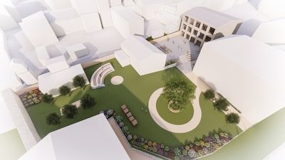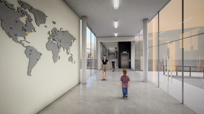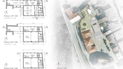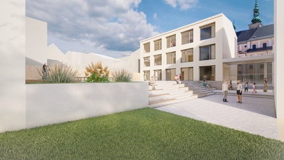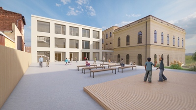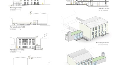 Pro město Broumov jsme v místě budovy č. p. 80 navrhovali objekt, který poskytne adekvátní a komfortní zázemí pro školní družinu a šatny základní školy Hradební. Řešení respektuje kontext místa, které leží v městské památkové rezervaci. Dispozice novostavby je rozvržena do tří podlaží. Zatímco v přízemí jsou situovány šatny a vstup do budovy, ve svrchních dvou patrech nalezneme prostorné učebny. Chodby a schodiště navazují na nově navržený spojovací krček do historické budovy ZŠ. Uvažuje se rovněž s novým využitím školní zahrady, která je řešena jako univerzální mlatová plocha s možností zřízení pódia a doplnění přenosných laviček.