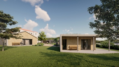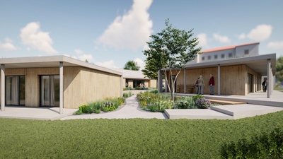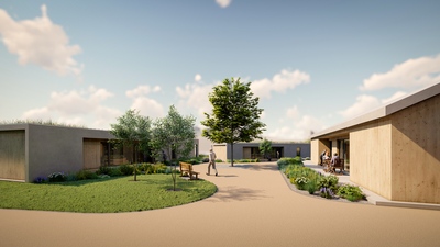 Pro Královéhradecký kraj jsme připravili návrh novostaveb tří objektů sociální rehabilitace s pobytovou formou. Pozemek se nachází na okraji města, v blízkosti historického centra, odděleného údolím řeky. Architektonický koncept pracuje s kontrastem „šedé schránky“ a teplého dřevěného interiéru. Jeden z objektů má šikmou střechu krytou světle šedým prefalcovaným plechem, ostatní jsou řešeny jako stavby se zelenou vegetační střechou. Fasády kombinují světlou šedou stěrku s modřínovým obkladem, čímž vzniká jednoduchý, přirozený výraz, který citlivě zapadá do prostředí.