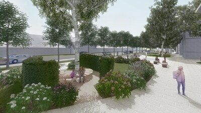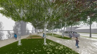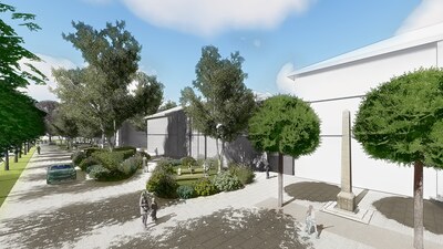 Celý předprostor je navržen jako sdílená zóna s kombinovanou dopravní a pobytovou funkcí. Dominantními prvky prostoru zůstávají památník a vzrostlá lípa, doplněná o kruhové sezení, které podporuje setkávání a odpočinek. Kompozici nově oživuje stánek s občerstvením a asymetricky rozeseté travnaté ostrůvky.