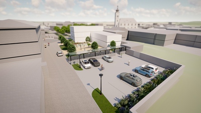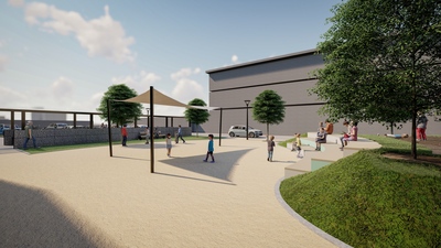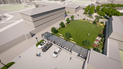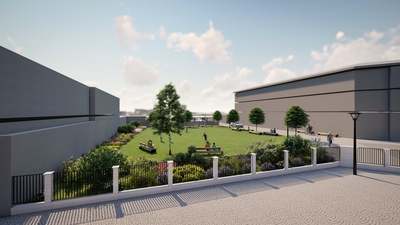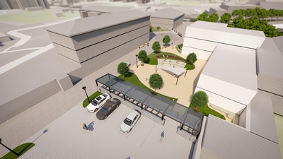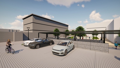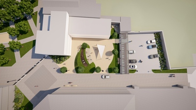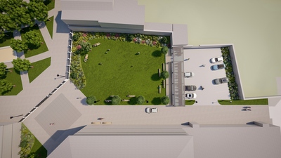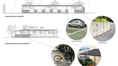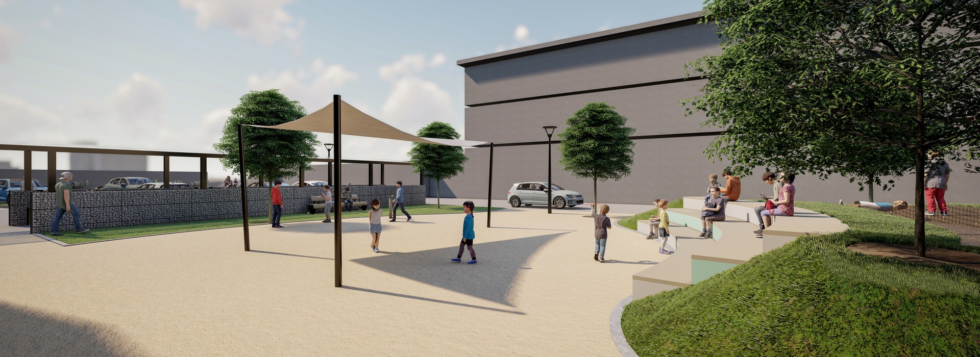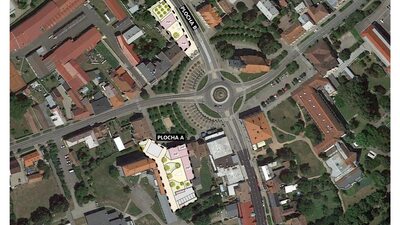 V lázeňském městě Lázně Bohdaneč je předmětem řešení návrh uspořádání volné plochy v těsné blízkosti Masarykova náměstí, jež vznikne při vstupu do školního areálu a po demolici domu čp. 110. V dlouhodobém pohledu je třeba řešenou plochu vnímat jako proluku, jedná se o cennou parcelu na náměstí v centru města. Prostor bude doplněn sadovými úpravami zahrnujícími výsadbu stromů a trvalkových záhonů včetně nových zpevněných ploch. Navrženy jsou terénní modelace, do kterých se umisťuje malé hlediště – sedací stupně a odpočinková síť pro děti. Místo pro případné pódium je doplněno zastřešením tvořeným stínící plachtou.